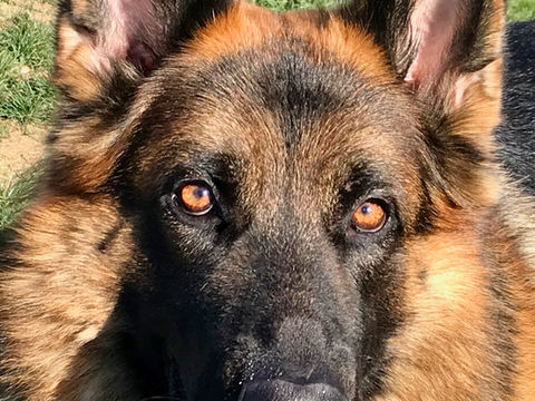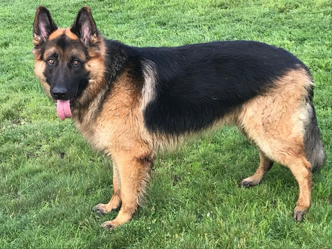 Is a straight back, large bone, long haired, old school German Shepherd. He is 120 lbs at 3 years old, just look at that massive head already! His temperament is what makes him amazing. He is highly obedient and a high ball drive but he also has a big heart. He is so sweet with our 3 kids and can be with others when properly introduced :) When strangers (like the mailman) come to the door, watch out, he is very protective of his pack and his bark sounds like a police dog ready for attack! He is amazing in every which way and we are blessed to have him in our lives.